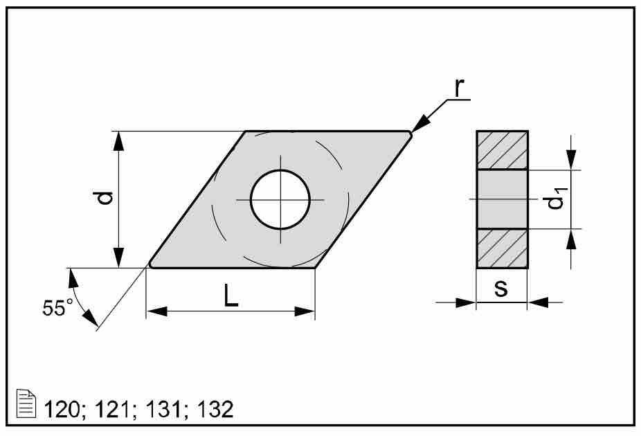 Пластина ромбической формы с углом 55 градусов, отверстием и стружколомающими канавками на двух сторонах.